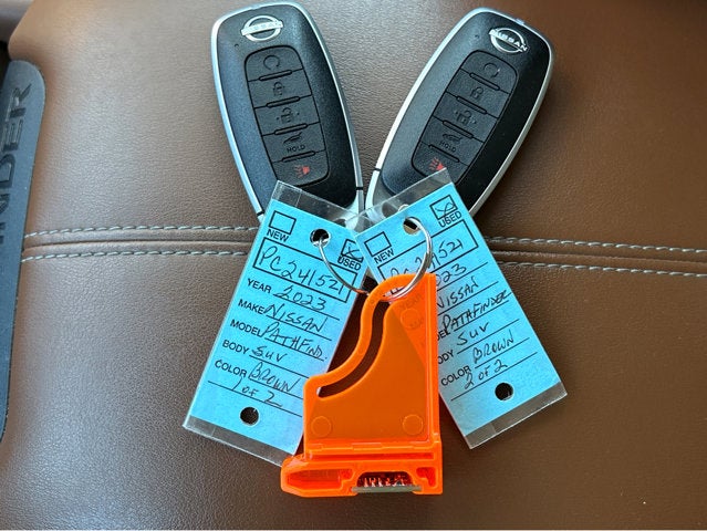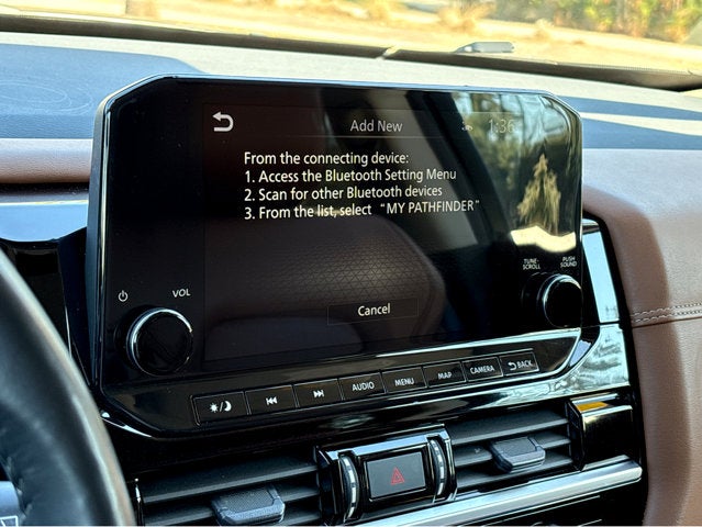 Vaden is pleased to offer 2023 Nissan Pathfinder Platinum in Baja Storm, Beautifully equipped with all the essentials and then some! Cargo Package (Cargo Area Protector, Cargo Net, and First Aid Kit), Tow Delete Package (Delete Tow Hitch Receiver & Harness), 13 Speakers, 3rd row seats: bench, 4-Wheel Disc Brakes, ABS brakes, Air Conditioning, Alloy wheels, AM/FM radio: SiriusXM, Auto High-beam Headlights, Auto tilt-away steering wheel, Auto-dimming Rear-View mirror, Automatic temperature control, Axle Ratio: 4.334, Bench Seat Carpeted Floor Mats (Set of 4), Black Splash Guards (Set of 4), Bodyside moldings, Bose Premium Audio System, Brake assist, Bumpers: body-color, Cross Bars, Delay-off headlights, Driver door bin, Driver vanity mirror, Dual front impact airbags, Dual front side impact airbags, Electronic Stability Control, Emergency communication system: NissanConnect Services, Exterior Parking Camera Rear, Four wheel independent suspension, Front anti-roll bar, Front Bucket Seats, Front Center Armrest, Front dual zone A/C, Front reading lights, Fully automatic headlights, Garage door transmitter: HomeLink, Heads-Up Display, Heated & Cooled Front Bucket Seats, Heated door mirrors, Heated front seats, Heated rear seats, Heated steering wheel, Illuminated entry, Knee airbag, Leather steering wheel, Low tire pressure warning, Memory seat, Navigation system: NissanConnect Navigation, NissanConnect w/Navigation & Services, Occupant sensing airbag, Outside temperature display, Overhead airbag, Overhead console, Panic alarm, Passenger door bin, Passenger vanity mirror, Power door mirrors, Power driver seat, Power Liftgate, Power moonroof, Power passenger seat, Power steering, Power windows, Radio data system, Radio: AM/FM Audio System, Rain sensing wipers, Rear air conditioning, Rear anti-roll bar, Rear reading lights, Rear seat center armrest, Rear side impact airbag, Rear window defroster, Rear window wiper, Reclining 3rd row seat, Remote keyless entry, Security system, Semi-Aniline Leather Seating Surfaces, Speed control, Speed-sensing steering, Speed-Sensitive Wipers, Split folding rear seat, Spoiler, Steering wheel memory, Steering wheel mounted audio controls, Tachometer, Telescoping steering wheel, Tilt steering wheel, Traction control, Trip computer, Turn signal indicator mirrors, Variably intermittent wipers, Ventilated front seats, and Wheels: 20" Machined Alloy w/Dark Met Gray Finish.